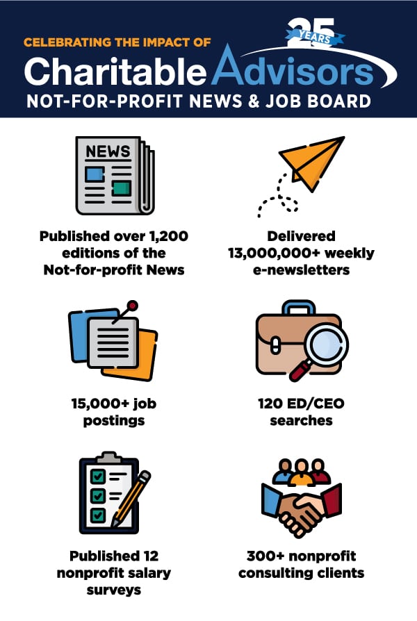 Charitable Advisors’ 25th anniversary serves as both a celebration and a recommitment. The weekly Not-for-profit News will continue every Tuesday at noon, delivering timely updates and resources to nonprofit leaders. The “Work for a Nonprofit. Make a Difference.” campaign will return in May, and new virtual and in-person opportunities are planned to help professionals form connections, share ideas and strengthen networks.